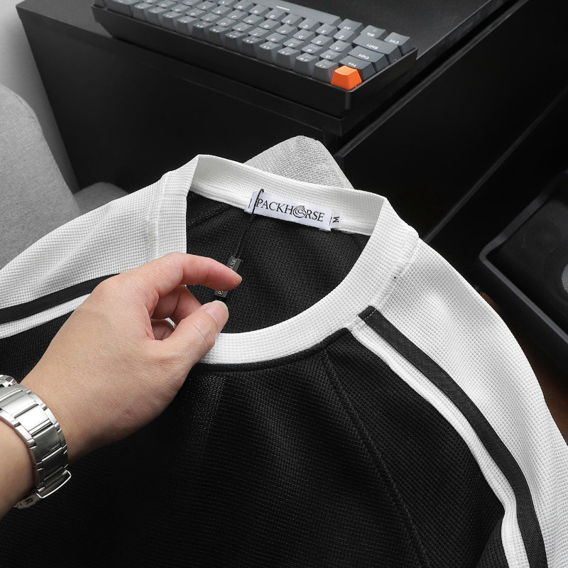 - Chi tiết nổi bật: Thêu logo PACK trước ngực, vai phối sọc thể thao cực trend.
