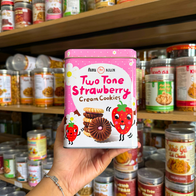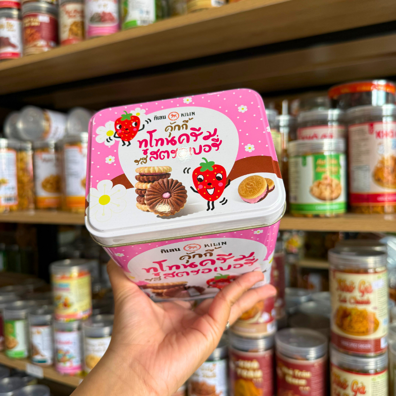Bỏ sỉ bánh Quy Nhân Dâu Hộp Thiếc KILIN Thái Lan 400g – Hộp Hồng Trắng