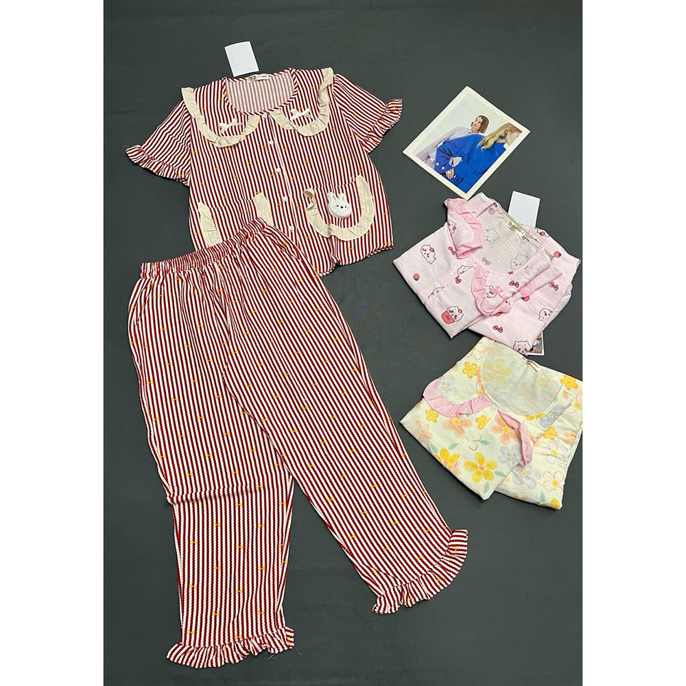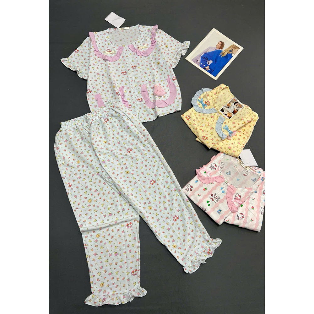 Đồ Bộ Nữ Áo Cổ Sen Tay Ngắn Quần Dài Họa Tiết Đáng Yêu Vải Cotton Hàn Mịn Mát Size 45-62kg
