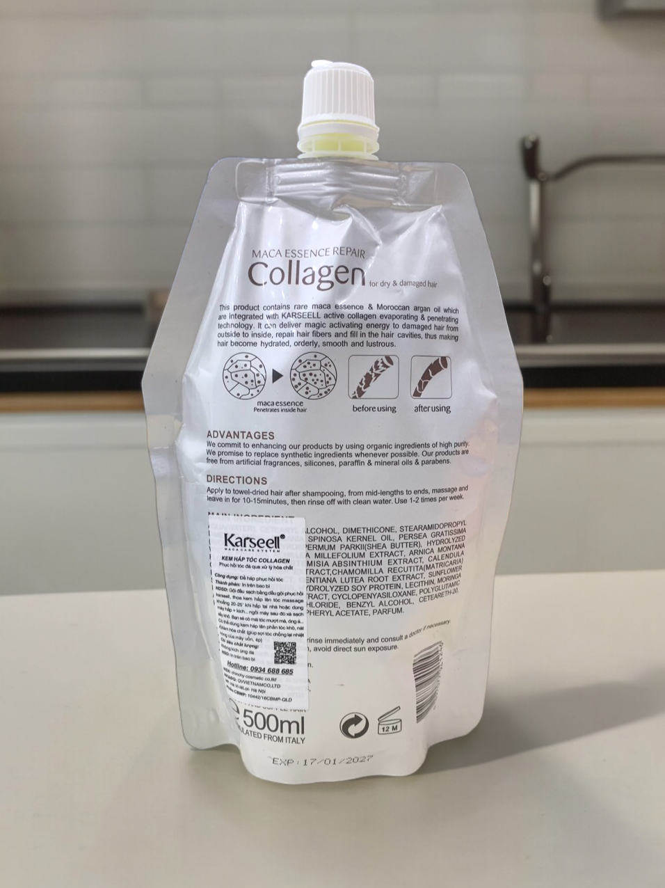 – Tại salon: Hấp tóc Collagen karseell được dùng để hấp dầu 15-20 phút bằng máy Ozon, hoặc kết hợp máy phun Nano làm dịch vụ phủ lụa collagen, pha vào thuốc uốn duỗi nhuộm tăng độ mềm bóng mượt.