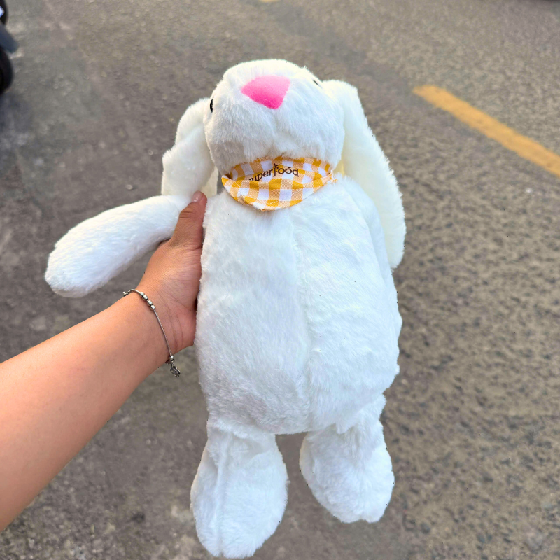 Em thỏ bông trắng tinh, lông siêu mềm, tai dài rũ xuống cực kỳ dễ thương. Điểm nhấn là chiếc khăn caro vàng xinh xắn ở cổ, nhìn vừa ngọt ngào vừa nổi bật.