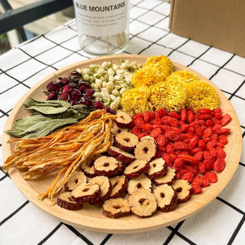 THÀNH PHẦN: Gạo lứt huyết rồng, đậu đen xanh lòng vỡ hạt, đậu đỏ vỡ hạt, nụ hoa hồng, nụ hoa nhài, kỷ tử, táo lát, cỏ ngọt, đông trùng hạ thảo.