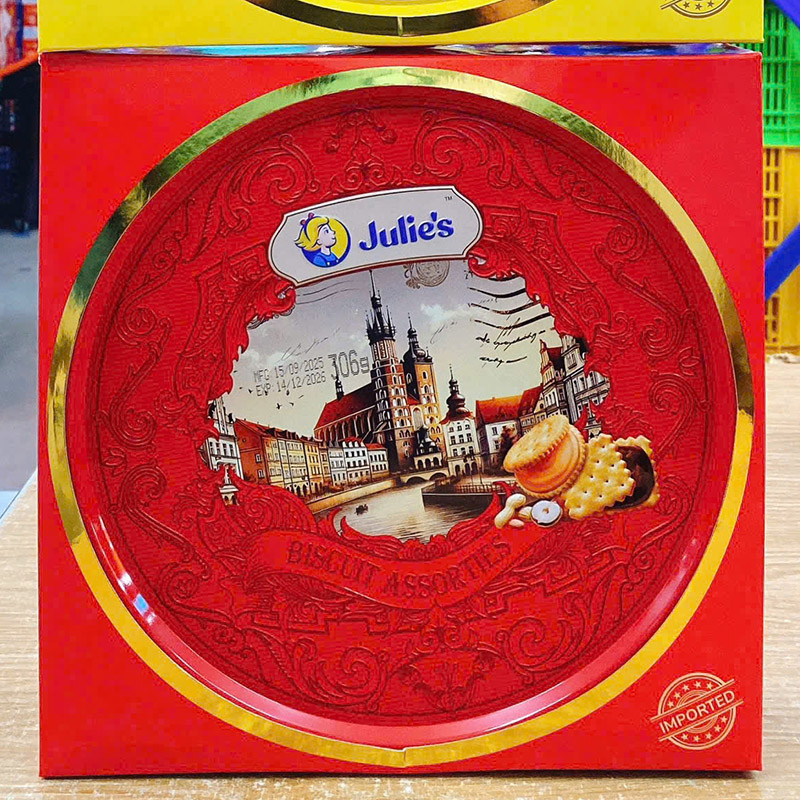 Phân phối bánh Quy JULIE’S Nhân Bơ Đậu Phộng Hộp Thiếc Phong Cảnh 306g – Hộp Màu Đỏ