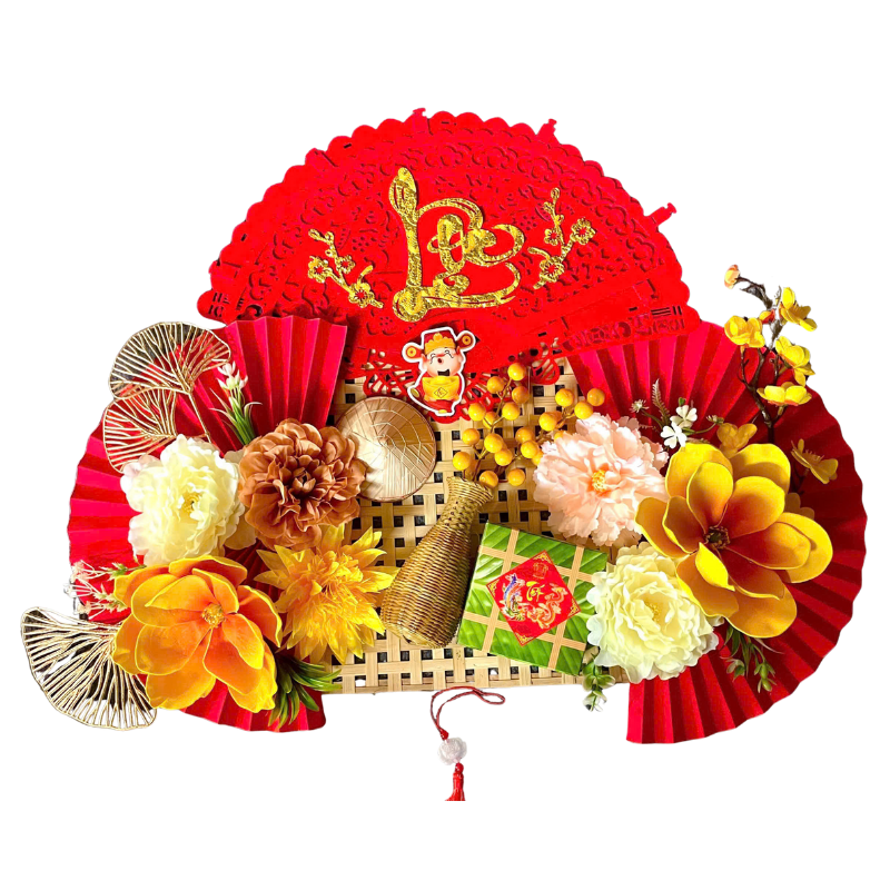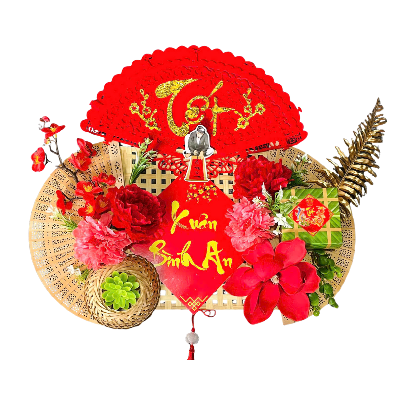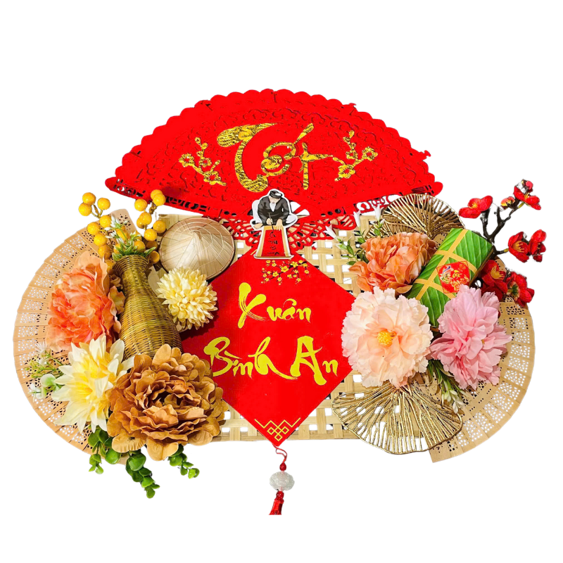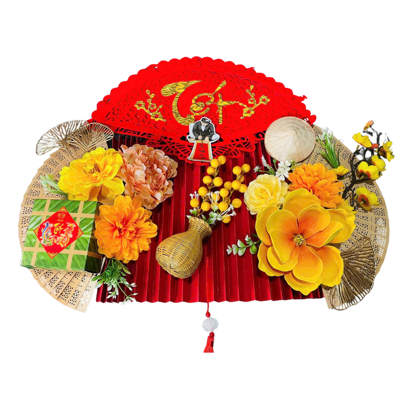 Mang trọn không khí xuân vào nhà chỉ với một bộ phụ kiện đầy đủ và hài hòa sắc đỏ – vàng may mắn. Set được phối sẵn quạt giấy đỏ, mành tre, hoa lụa, đào – mai, bánh chưng mini, bình rơm, dây tiền vàng và charm trang trí… tạo nên bố cục chuẩn Tết Việt, sang mà vẫn ấm cúng.