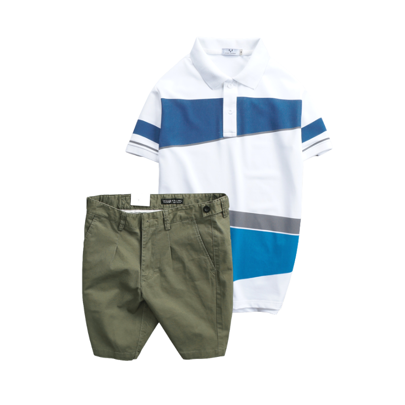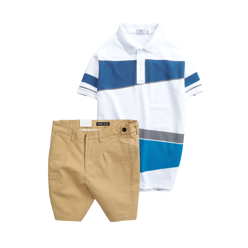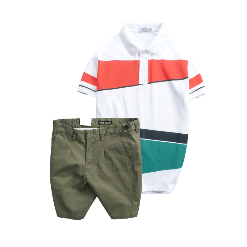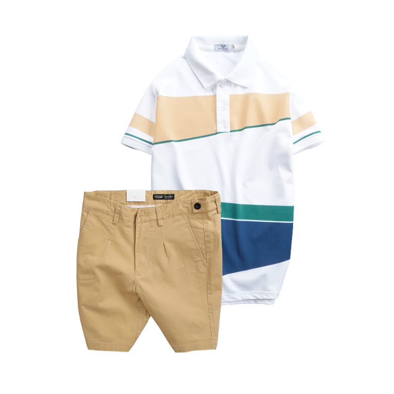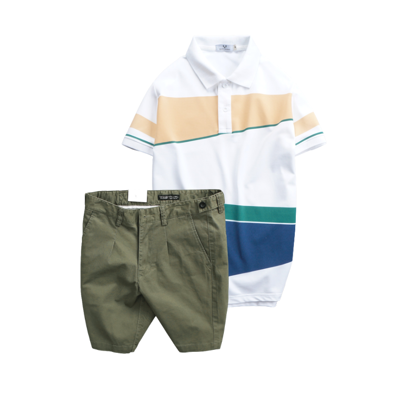 Set Bộ Nam – Áo Thun Nam Polo Cổ Bẻ Vải Thun Cá Sấu Poly Phối Kẻ Sọc Màu Và Quần Short Kaki Co Giãn Phối Nút Cao Cấp (Có Size 36)